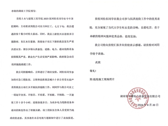 近日,英国上市公司官网365收到湖南省华耀电力设备安装有限公司的感谢信,对土木与建筑工程学院土木2301班学生刘怡东积极参与抗洪抢险、展现时代青年担当的行为表示感谢。
