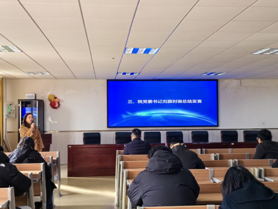 刘赢时作总结发言,她表示,一年来,在学校党委行政正确领导下,学院各项工作取得了新的突破,各位教师在个人发展上取得了新的收获,是全体教职工奋力拼搏的体现,是齐心协力创业的展现。2024年,希望全体教职工继续保持积极干事创业的热情,紧密围绕学院中心工作,主动担当作为,踔厉奋发,勇毅前行,为学校的高水平建设多做贡献。