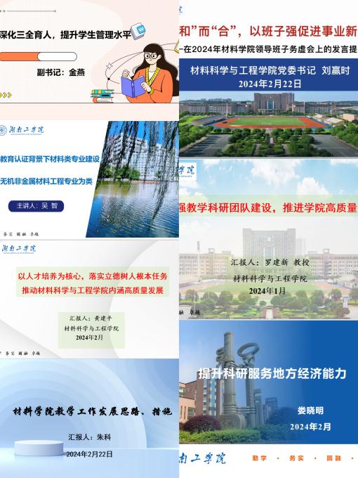 金燕围绕“深化三全育人,提升学生管理水平”发言,黄建平围绕“加强学院内涵建设”发言,吴智围绕“工程教育认证背景下材料类专业建设”发言,朱科围绕“材料学院教学工作发展思路”发言。