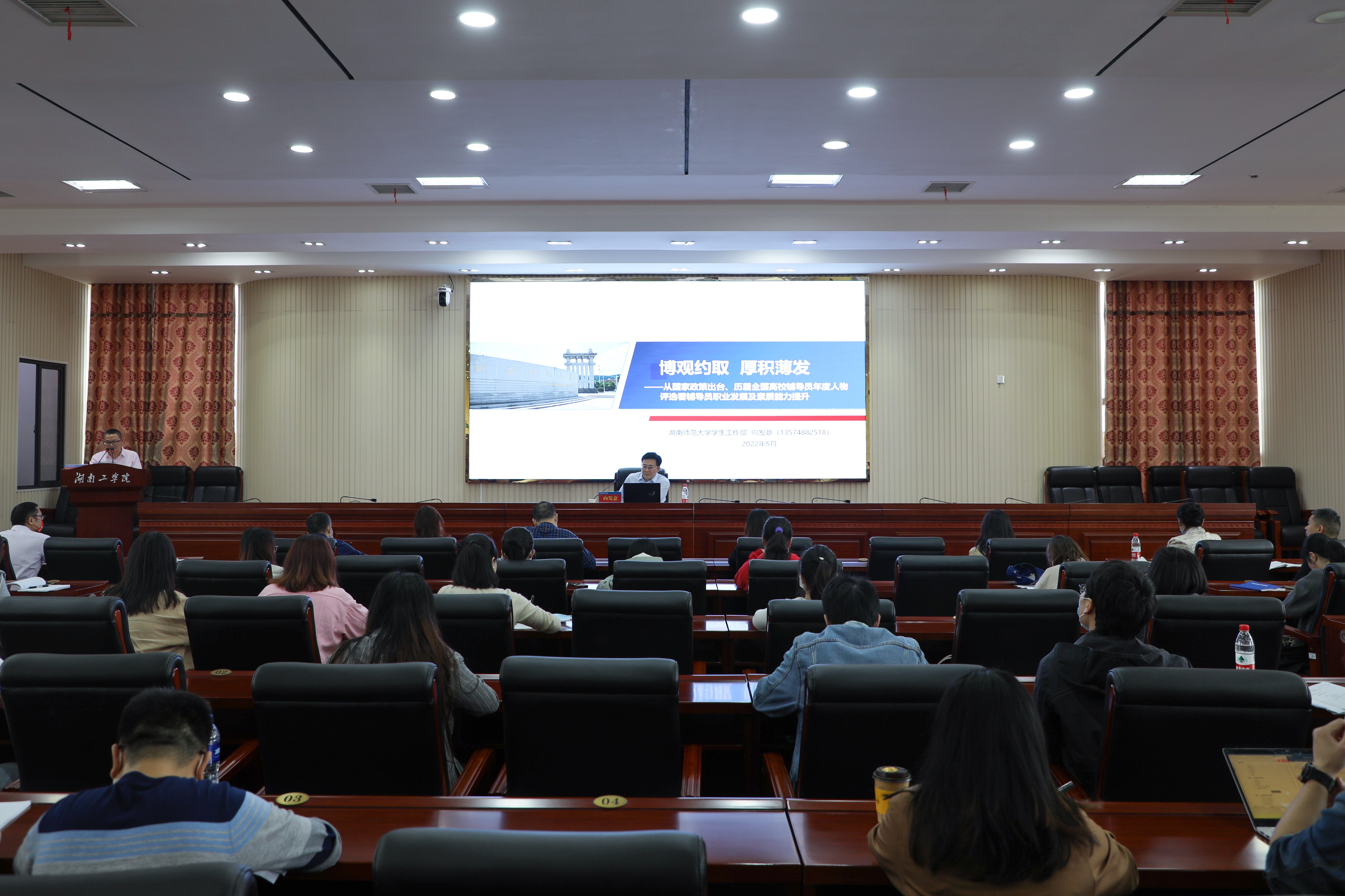 为进一步提升辅导员队伍专业化、职业化水平,5月13日下午,辅导员素质能力提升专题培训在教学大楼12楼报告厅举行。湖南师范大学学生工作部部长向发意担任培训主讲,学生工作部部长曹毅主持培训。