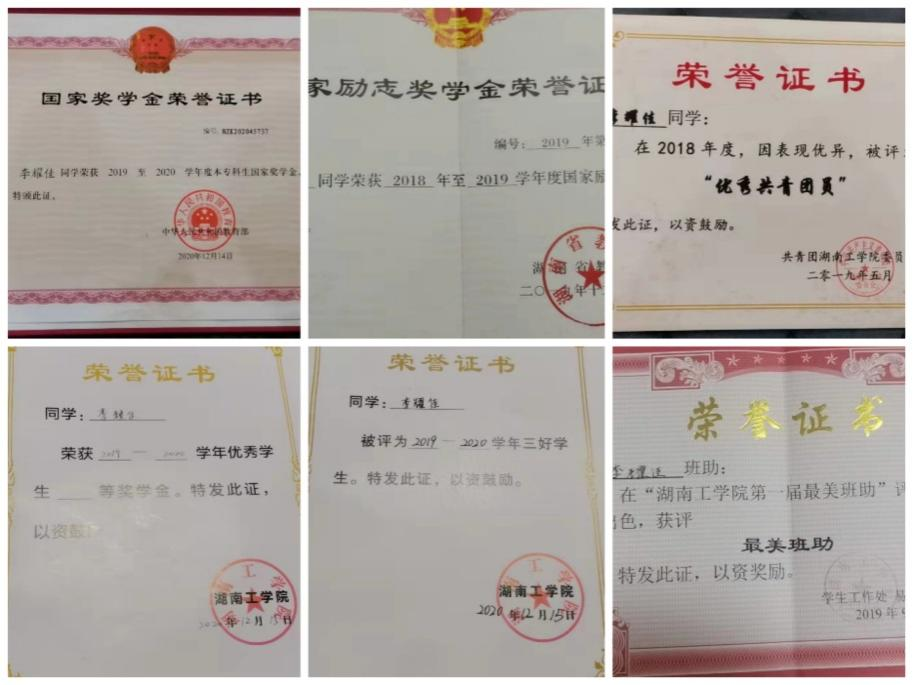 在校获国家奖学金1次、国家励志奖学金1次、校一等奖学金2次、三好学生2次、优秀共青团干部1次,三下乡优秀个人1次;顺利通过英语四级考试,国家计算机二级考试;在课余时间,积极参加学校各类学科竞赛,志愿者活动。